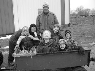 The Schleich Farm Set has been popular with my boys and they have slowly been collecting animals for their farm. Their favorite store is Rural King and they really wanted the barn to go with their animals. Justin promised them that when he was done with work for the winter, he'd build one with them. Yesterday and today, they've been working on their project. The picture they copied, is to the left. They used the exact dimentions and everything. My pictures are out of order. Here are the troops this evening going down to the "workshop" to clean up the mess. Madeline doesn't want to be left out of anything! There she is with her pink gum boots on!